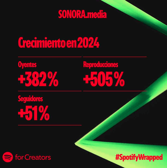 SONORA.media revisó su Wrapped y descubrió que tuvo un gran crecimiento respecto al año pasado: 505% más de reproducciones, un aumento de 51% de seguidores y 382% más de oyentes. De ellos, el 96% fue nueva audiencia.